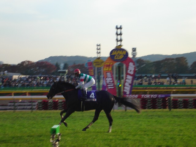 はずれ。。ハーツクライが(馬券対象から)飛んでしまうなんて。。。(T_T)単純にサムソンよりドリパスのほうが強くなったんだなぁ。。。(T_T)東京9R 購入500円 →払戻990円 10R 購入3000円 →はずれ収支 -2510円8Rが始まる頃、東京競馬場に到着。もうパドックには人垣で近づけない感じ。スタンドに向かうと、、、げっ、こっちも人だらけ!どうしようかとうろうろしてると、立看板に"障害コース開放"って書いてあるのを発見。地下を通って内馬場へ。おっ、こっちはまだそんなに混んでない。ロープ際の最前列を確保できました。今日はジャパンカップだけにしようかとおもったら、パドック画面でみたことある馬名を発見。こないだ買ったエアシェイディとブラックバースピン走るのか~。我慢できずに馬券購入。いや~、当たってよかった。(^-^;)すぐそばにゲートが運ばれてきて、誘導馬が前を通過して、、お~きたきた!本馬場入場!観戦中の麻生外務大臣がオーロラビジョンに映し出される。そりゃ~政治家だって見たいよね~。旗が振られてファンファーレ。すげ~!スタンドの手拍子が波みたいに見える!さぁスタート!ディープは控えて最後方!大丈夫かぁ~?('.';)なんて見てたけど4コーナー回って直線にきて、うわ~きたきたきた!!ディープ勝った~!(^。^)しかしハーツクライが居ない~!(>。