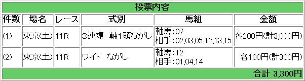 ◎7ムード,○10ダイワ,▲18デアリングマイルCS。ダイワメジャー勝っちゃうかなぁ。。しかし天皇賞でのリベンジをきっと果たしてくれるはず。ってことでムード本命。外国馬は強いのかなぁ?なんか3月にユートピアに完敗してるらしいので、消そうかと思ったけど一応ワイドで。3歳馬はシンスケクンとキンシャサを選択。ロジック、シェンク、ホーネット消し。テレグノシスとハットトリックも消し。さんざん裏切られてきたのでもうだまされません。前走スワンS上位の馬にがんばってほしいなぁ。。◎7ダンスインザムード○10ダイワメジャー▲18デアリングハート△3プリサイスマシーン,9ステキシンスケクン,14キンシャサノキセキ×1コートマスターピース,16シンボリグラン,17アグネスラズベリ買い目三連複BOX 3-7-9-10-14-18 計20点 @100ワイド流し 7-1,16,17 @100馬連 1-13 @100