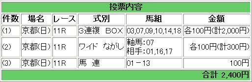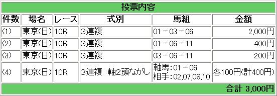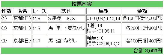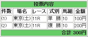◎6ディープ○1ハーツ▲3ウィジャディープは飛ぶのか?それとも違う意味で飛ぶのか?!これに尽きますね。軸でいいと思うんだけどなぁ。。そういえば去年の有馬記念で、3連複の楽しさに目覚めたような気がします。TVの向こうでディープ敗戦にショックをうける人たちを見ながら、一人ニヤニヤしてたっけ。('ー';) というわけで今回も3連複。そういえばハーツクライとウィジャボードって2回戦ってるんだなぁ。。3月のドバイシーマクラシックでハーツ1着、ウィジャ4着。去年のジャパンカップでハーツ2着、ウィジャ5着。2度あることは3度ある?3度目の正直?どっちだろ?実質海外馬の3頭の1画をくずせるのは、、って思ったらそういやコスモバルクも海外勝ってたっけ。スウィフトカレントと勝ったり負けたりだし、ちょっと厳しそう。凱旋門賞でディープが3歳馬レイルリンクに負けたことを考えて、3歳馬ドリパスとサムソンで保険かけて、そういや凱旋門賞でディープは牝馬プライドにも抜かれたっけ、、なんて事も考えていちおうフサイチパンドラ保険も掛け捨てで。よし!勝負!! さて、これから場所取り勝負もしなきゃ(-_-;)今から行ってよく見える場所なんてあるかなぁ。。。?◎6ディープインパクト○1ハーツクライ▲3ウィジャボード△11メイショウサムソン×2スウィフトカレント 7ドリームパスポート 8フサイチパンドラ 10コスモバルク買い目 3連複 1-3-6 @2000 1-6-11 @400 3-6-11 @200 軸[1-6]-2,7,8,10 @100