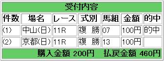 今日の競馬予想 中山11R 複勝7ミヤビランベリ 京都11R 複勝13ピイラニハイウェイ @100。