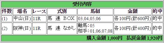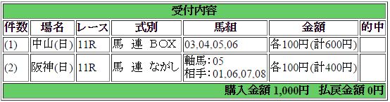 はずれ。(T_T)中山11R馬連 8-12 62,380円 95番人気阪神11R馬連 6-16 11,010円 30番人気・・・つまみ食いは体によくないらしいです。(T_T)