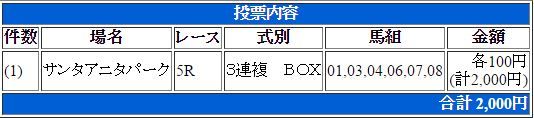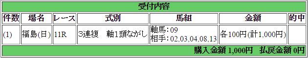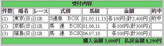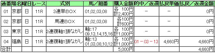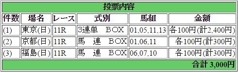 アルゼンチン共和国杯は1~4人気で3連単ボックス。ここ2年、4番人気までで決まってるしなぁ、という根拠のない予想です。あとは京都福島をちょこちょこと。今朝の結果。デットーリ買ってない。。。(T_T)
