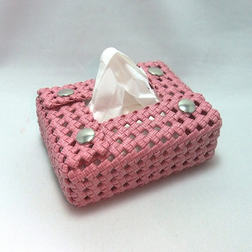 遅咲きの庭の梅も満開になりました。春がすぐそこまで来ていますね。暖かくなるのは嬉しいですが、花粉症の方には悩ましい季節かもしれません。ということで、花粉症用のポケットテッシュケースを作ってみました。ポケットテッシュが3個入る大きさ(11㎝×8㎝×4㎝)で、ギリギリ持ち歩くのに、邪魔にならない大きさです。開くとこんな感じで単純な形です。ふたの部分を井桁に組む形にすることで、形が崩れにくくなっています。このテッシュケースは兎屋さんの新しいバンド「軽量ぺったんこバンド」で編んでみました。結び編みには本当におすすめのバンドです。編みやすいのはもちろんですが、バンド割いて使うことの多い結び編みに、約数の多い12本幅という点も嬉しいです。編みあがりも、軽量というだけあって軽いです。バンドが薄いので、意識しなくてもきれいにコマがそろいます。コマがそろうので、編みあがりもきれいな四角です一番心配だったのは、編地が薄い分水を吹き付けて形を整えたときに、フニャフニャにならないかということでしたがきれいに形が整って、形も崩れませんでした。また、編地が薄いのでいつもつけるのに苦労するバネホックも、本当につけやすかったです。あとは、色の展開が少ないので、もっと増やしてほしいな~。