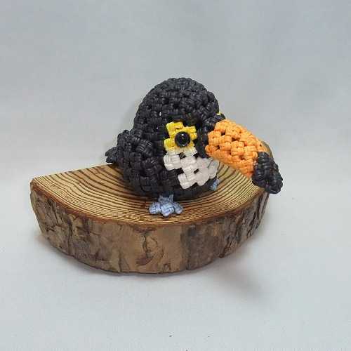 今週は、曇り&雨の天気予報。明日あたり、千葉も梅雨入りでしょうか。ジメジメ、ムシムシのこの時期は不快指数は高めですが、紙バンドが湿気で、柔らかくなるので結び編みには嬉しい季節です♪さて久しぶりに鳥シリーズの仲間を作ってみました。「オオハシ」黒白に色鮮やかなくちばし。特徴的な大きなくちばしは、体温調節をするための放熱器として役立っているそうです。横から後ろから