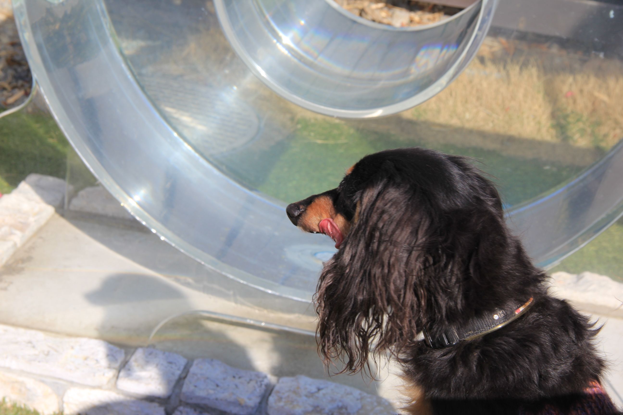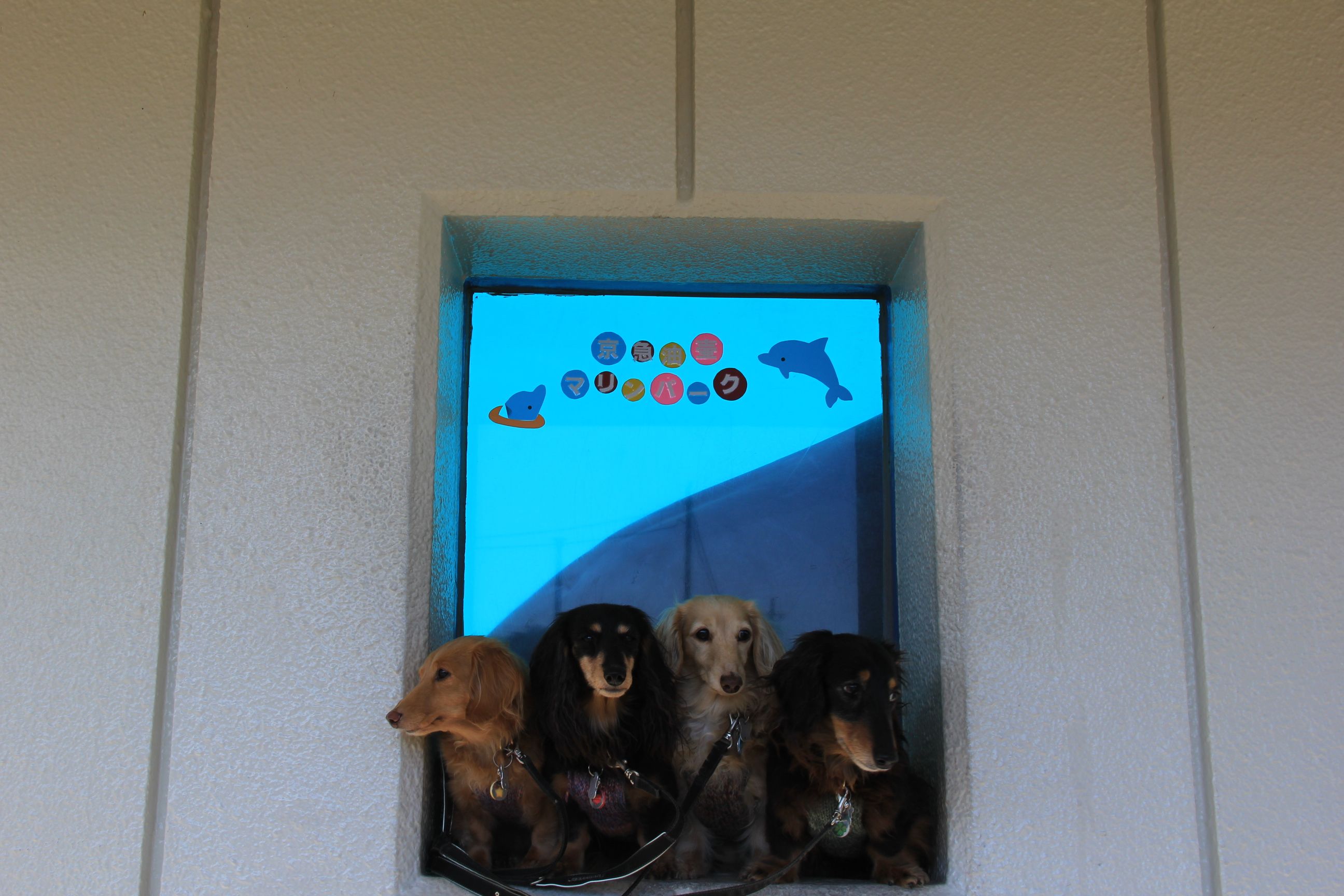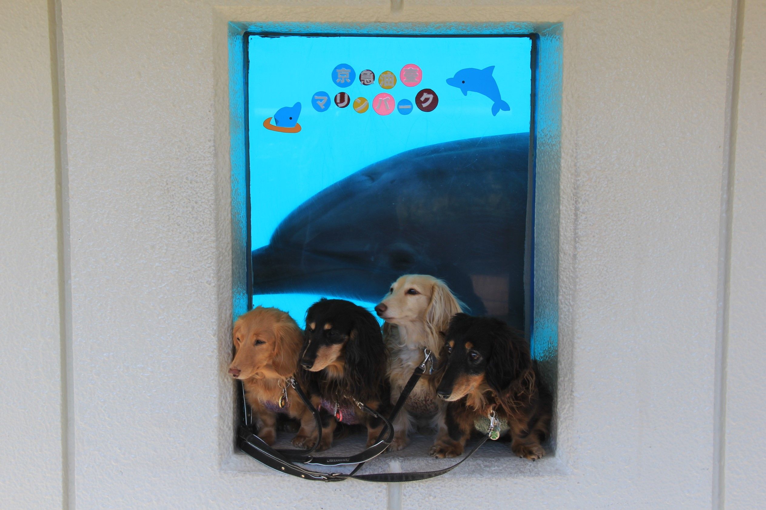 ここにはわんこ好きのイルカさんがいて、観察窓にわんこを見つけると寄ってきてくれるの