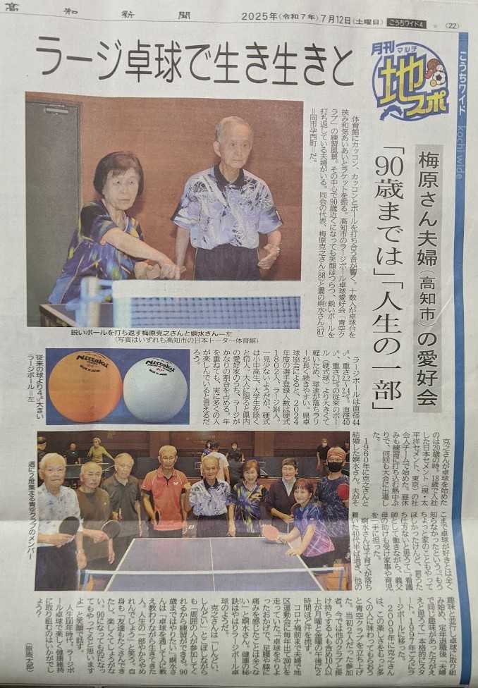 高知新聞で初めて見たのだが、卓球に今までのボールより少々大きい球の競技があるそうだ。直系が今までの球より4ミリ大きいだけだそうだ。 この大きさの違いで、球が受ける空気抵抗が、少々大きくなり、動きが今までの球より、少々遅いから、年齢を重ねたお年寄りも、十分に楽しめるそうだ。 卓球は、日本では昔から、誰もが楽しんでいる競技だが、そんな違いのある卓球が有るとは知らなかった。 我が家でも、夫婦で楽しめるのは卓球ぐらいだが、それでも急速が早いから、無理と思っていたが、これなら出来るかもね。卓球台を作って楽しんでも良いかも。卓球にラージ球があるそうだ、知らなかった。