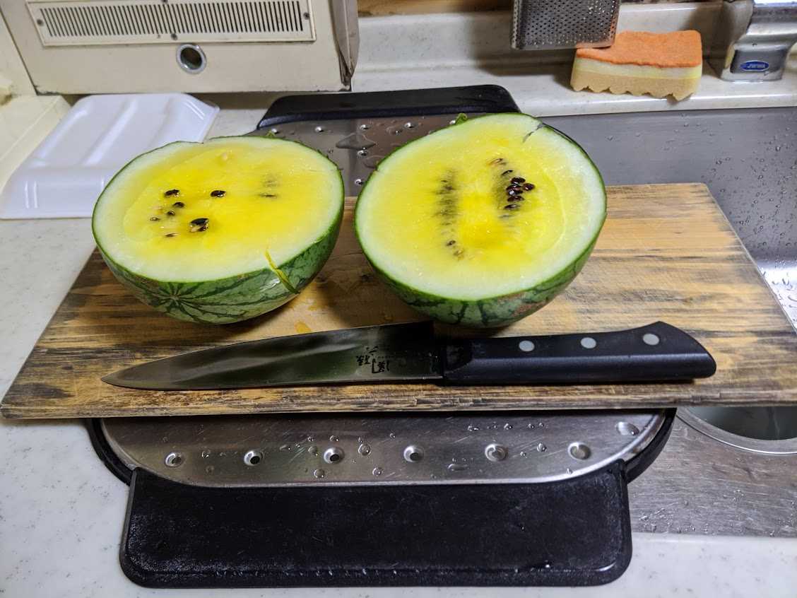 今年初めてのスイカが出来た。切って見ると黄色いスイカだった。食べると結構甘く美味しいスイカだった。全部で6本程植えているから、これからもドンドン出来るので、楽しみだ。