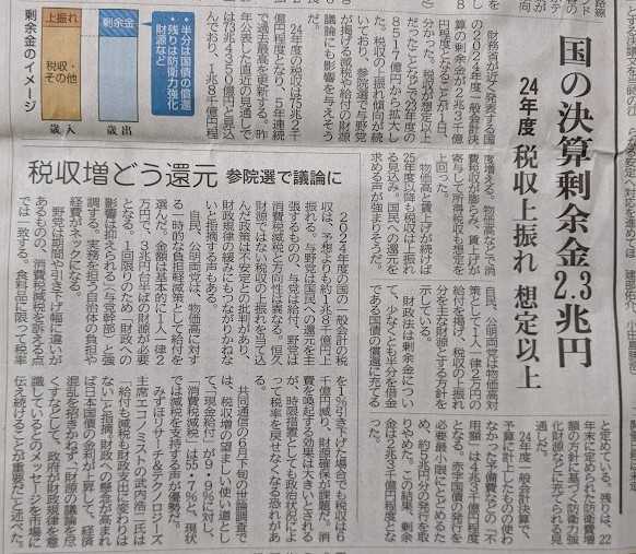 新聞で見たが、国の決算で、税収が伸び、今年は余剰金が出るそうだ。そしたらその全額を国債の償還に使うべきなのに、その半分だけを償還に使うそうだ。 そして残りの半分は防衛力に回すようだ。防衛も当然ながら大切だが、これだけ借金を重ねて来た日本だ。1000兆円以上の国債が積もっており、余剰金の全額を国債償還に回して欲しい。 借金は少しでも少ない方が良い。だけどマスコミはそんな報道を殆どしない。私は若い時から、自宅を建てた時以外は、絶対に借金をしなかった。何時だったか忘れたが、その住宅ローンも約束よりかなり早めに返済を終えた。つまり、必ず収入以下の生活が基本だったから、早く払い終えたのです。時々、多額の金利を払っている人が居る様なので、驚いている。