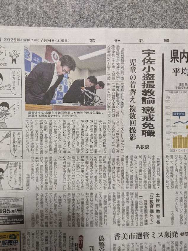 まあ、この世には男女しか居ないのだし、男女間で色々些細な問題が発生するのは当然なのだが、その中でも最近は学校の先生の児童盗撮事件が結構多くなったと感じる。 だけどどうして最近こんな事件が多いのは何故なのだろうか。そして殆どが若い先生で、特に先生と言う職業は避けるべきだと思う行動だ。多分先生に成る前に、本人が受けた、社会や学校での、環境に問題が有ったのだろうと想像する。つまり環境が悪かったのだろう。 特に、社会環境全体の悪化が大きい様に感じる。何故かアッチコッチで、盗撮だけでなく、この様な馬鹿な些細な事件が多発しているのが報道され、それ等に段々と感化されての行動だろうと推測する。 シッカリと自分の人生基準が固まって居ない若い時の社会環境で、これから伸びるべき人が感化されて行くのだろうから、困った事だ。 恐らく、大昔から日本人が育んで来た大きな社会的基準である「恥ずかしさ」と言う基準が、最近は何となく希薄に成って居るのが、大きな原因ではなかろうかと推測する。 この「恥ずかしさ」は日本人が育てて来た結構大きな社会基準なのだが、この基準があるから、日本は結構住み易い良い国に成っていたのだ。これが希薄になると、些細な事件が多く発生するだろうと思う。 恥ずかしさの基準が余り厳しくない国では、こんな事件が昔から相次いでいるが、日本は少なかったのだ。 その上また、色々なカメラが増え、写すチャンスが増えたのも大きな一因だろう。昔は簡単に何時でも写真撮影は出来なかった。それが今では誰もが持って居るスマホで簡単に撮影できるし、盗撮に便利なカメラも作られている。そんな、こんな色々な理由から、盗撮が増えているのだろう。 そして驚いたのは、25日の新聞で、高知県の教員採用方法を検討するとのニュースが掲載された。こんな盗撮事件が少ない県と多い県が有りそうで、少ない県の採用方法を参考にするのは当然だろうと思う。