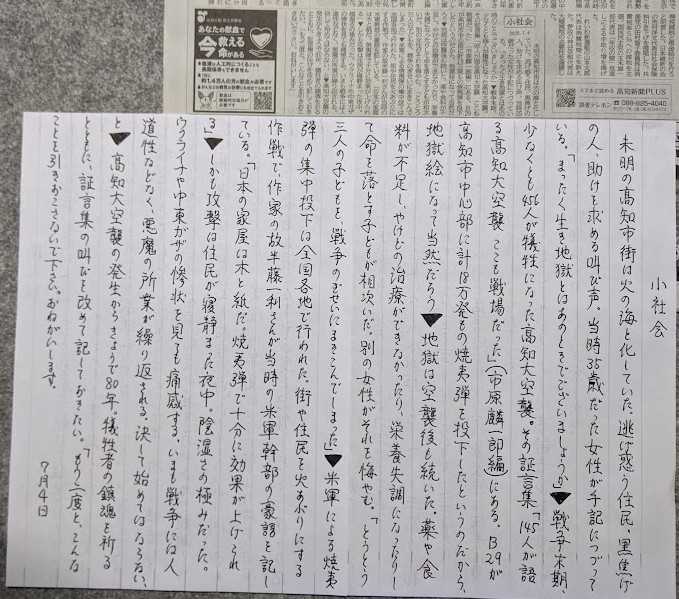 何時から新聞コラムを筆写し始めたのか忘れたが、恐らくもう10年以上には成るだろう。 私は悪筆で、自分の書いた字も読めない位の汚い字を書く。そんな事から大分前から新聞の筆写を始めたのです。 約600字のコラム「小社会」を、ゆっくりと40分掛けて、筆写している。段々字も綺麗に成って来た様にも思える。 7月4日の新「小社会」です。