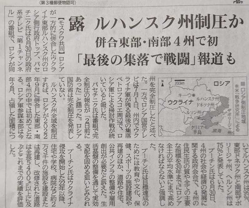 8月18日停戦交渉が有るそうだ。こんな事を言うと笑われるかも知れないが、ウクライナ東部2州をロシアに渡して、完全な平和が維持される方法を望んでいる。戦争に寄る国境の健康は悪い事だが、一日でも早く戦争を終えて欲しいのです。 まあ素人の私の意見だが、国境を接した国々は、国境付近の住民は多くが両国の人々が混じって住んでいる。だから、この2州も恐らくウクライナとロシア人で半分半分の民族構成だろうと推測する。 要するに、ドッチがドッチか分からない位、血が入り混じっていると思う。そう言えば数十年前は同じソ連だったのです。 日本の様な島国だと、国境が海だから、住民が混じって住む事は余り無いが、大陸国家だと、混血が多いと推測する。だからこの2州をウクライナが放棄して和平を実現して欲しい。 まあ新聞の見出しでも「割譲は拒否」と大きく書かれているが、割譲しても、その2州は両国民が半々に住んでいるのだから、良いと思うのです。 何時までも、殺し合いの戦争は止めて欲しいものです。ドッチにしても殺し合いは良く無い。
