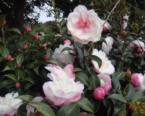 市場祭りの帰りの道沿いの生け垣に『山茶花』の花が咲いていました。この時期、花が少なくなる晩秋ですが、赤や白の山茶花の花は、存在感を示す時なのです。そしてこの花は長い間咲き続け、正月を迎えても咲いているものも多いのです。椿(つばき)の中国名「山茶花」が、いつの頃からかこのサザンカの名前として 間違って定着したようです。読みは「山茶花(さんさか)」⇒「茶山花(ささんか)」⇒「さざんか」というぐあいに変化したらしいのです。日本が原産地。江戸時代に長崎の出島のオランダ商館に来ていた医師が ヨーロッパに持ち帰り、西欧で広まったとのことです。山茶花と椿は似ていますが,どこが違うと思いますか? ツバキ(椿)の花は落ちるときにボテッと全部一緒に落ちてしまいます (このことが斬首刑を連想するのか,武士は椿の花を嫌ったそうです)が, 山茶花は花びらが一枚いちまいばらばらに散るのです。 そして遠くからでは気がつきませんが、近くによって葉を見つめてみると サザンカは、葉縁が小さくギザギザしているのです。 サザンカの花言葉は、「困難に打ち勝つ」、「ひたむきな愛」。 サザンカは「たき火」「さざんかの宿」など馴染みのある歌があるように、 昔から庭や垣根などに植えられている常緑の花木です。 昔から品種改良が盛んで、純白から深紅まで多くの花色があるようです。 春にチャドクガの幼虫(毛虫)が発生します。葉を食い荒らして丸坊主にしてしまい ますので、見つけしだい薬剤を散布して駆除する必要があります。 私も以前に経験しましたが、誤って触れると毒毛によって皮膚がかぶれて ピリピリとした痛みがなかなか取れないので気を付けましょう。 花が少ない初冬の季節に華やかで凛として咲いているサザンカを見ると 『なぜ冬を選んで咲くんだろう』と想いを巡らし、何故か元気がでる アラカンオジサンなのです。 そして口ずさむのです。♪♪♪さざんか さざんか 咲いた道 たきびだ たきびだ 落ち葉たき あたろうか あたろうよしもやけ おててが もうかゆい♪♪♪