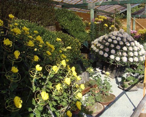 菊花展に立ち寄ってきました。秋も深まり、菊の花が見ごろを迎えました。テレビのニュースによるとたくさんの菊花展が開催されているようです。 特設の幄舎に千本咲・大懸崖・盆庭・菊人形などが見事に並んでいました。 鮮やかな黄色が美しい大菊盆養(3本仕立て)です。厚物(厚走り)と呼ぶのだそうです。厚物の花弁の下に長い花弁が走るように垂れ下がっています。 背丈の低い「福助」が見事に並んでいました。 そしてその横には盆栽展も同時に行われていました。 中国の水墨画を思い出すような見事な盆栽です。 小粒の鉢物も展示を工夫し、見事なバランスを示していました。 色鮮やかで優雅な菊花を観賞して、秋の訪れを大いに感じ楽しんだのでした。