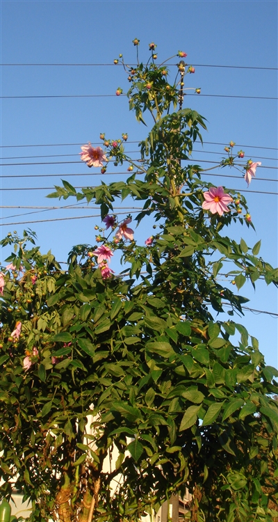 我が家の『皇帝ダリア』が漸く花をつけ出しました。今年も、台風の風にやられ何本かは倒れましたが、何とか倒壊を免れた何本かが開花しだしたのです。この花の特徴 は、第一に大型であるということです。成長すると3~6mほどになります。この時期、背が高いためよく目立つのです。この時期、ピンクの花が珍しいので尚更です。別称、木立ダリアと呼ばれることもあります。数年前苗を購入し、畑の隅に植え付けましたが、見事な大きさになるまでに成長しました、いや成長しすぎました。日本には、ダリアは江戸時代後半にオランダ人によって、はじめてもたらされたと言われています。和名は、天竺牡丹(テンジクボタン)とも。これは、ボタンに花の形が類似するためです。そして皇帝ダリアが長い年月の品種改良の歴史から生まれたとのことです。メキシコ原産,ダリア界の王様と言われ,花色も赤,白,ピンクなど数種あるようですが未だ赤や白の花は未確認です。我が家で今開花しているのは一重のもの。この花の反対側の農園にもう一本八重のものがありますがこちらはまだ開花には間があるようです。凛として初冬の畑隅に聳え立つ 「皇帝ダリア」の花 誇らしげ・・・・詠み人知らず