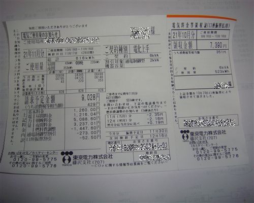 東京電力さんから11月の『電気ご使用量のお知らせ』が届きました。使用量:616KWH昼:43KWH 朝晩:220KWH 夜:353KWH使用料金額:9028円 と言う結果になりました。 売電量は302KWHとなりました。昨年売電量:311KWHを僅かに下回りました。今回の検針期間は10/19~11/16の29日間でした。よって11/1からは48円/KWHで東京電力さんが買ってくれると思っていました。ところが『余剰購入電力量のお知らせ』は先月と同じ書式。養蜂の師匠の相模庵さんのブログから11/1から48円/KWHではないことを知ったのでした。 東京電力さんのHPにアクセスしてみると、何ときちんと書いてあるではありませんか。 『新買取制度における買取単価は、平成21年11月の検針日以降発生する余剰電力について適用いたします。太陽光発電設備を設置以降10年間は、同一の買取単価で買い取らせていただきます(新買取制度実施以前に設置された場合は、平成21年11月の検針日以降10年間といたします)。 なお、買取単価は年度ごとに低減される方向で見直されていくことになっています。』敵も然る者でした。きちんと11月の『検針日以降』48円/KWHであることの説明責任を果たしているのでした。完敗です。気持ち的には16日分で165KWHの売電実績、約4000円程度損した気分ですが・・・・・。我が儘な発電所長の独り言でした。