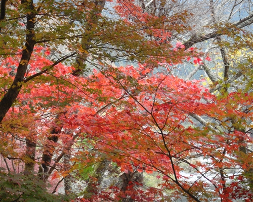 旅に出ています。昨日は『香嵐渓』、いろは紅葉が赤、黄にも見事に染まっていました。曇りがちの天気でしたが、時々太陽が顔を覗かせ、葉が光り輝きだしたのでした。しかし、地元のボタンティアのおじさんによると、去年より赤みが鮮やかではないとのこと。これも台風の影響でしょうか。今日はこれから小原の四季咲き桜を見に行きます。車で1時間程度とのこと。紅葉と桜の競演を楽しみたいと思っています。