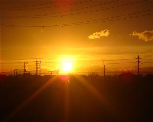 昨日の朝焼けを日が昇るまで追いかけてみた。東の空が赤く染まってきた。ズームしてみると雲の端が線上に輝き始めていた。日の出である。西の空には月が日の出を見つめていた。そして今日の活躍を約束するかのように、太陽光パネルも朝日をあびて赤く光っていた。