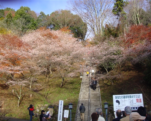 最終日のこの日も、早朝6時出発、もちろん渋滞回避が目的です。この日は東名高速で帰路につかなければならないのです。今回はメンバー全員が皆punctualityに徹しているのであった。ホテルからKさんを迎えに行き、その後東名岡崎ICへ、豊川JCTから東海環状自動車道を豊田藤岡ICでおり一般道を。最初に『川見の里四季桜公園』を訪ねる。薬師寺の下の駐車場に車を止めた。早朝出発大成功であった。この薬師寺は、地元の人々からは「川見の薬師さん」と親しまれている、真言宗高野山派の古刹。本堂に安置されている、寄木造りの薬師如来像は、室町時代後期につくられたもので、文化財に指定されていると。正式には『瑠璃光山薬師寺』、四季咲き桜の名所なのである。続いて川見四季桜公園のある山に挑戦、ここには約1,200本もの四季桜が植栽されていると。、桜が山全体に咲き誇り、まるで別世界のような風景。四季桜と紅葉が混在した幻想的な錦絵を描き出しているのだ、小原地区でも最大のビューポイントだと駐車場のオジサンも誇らしげであった。山のふもとから見ても、上から見ても、薄桃色の桜の花々のなかに赤や黄に色づいた紅葉、皆無言の感動であった紅葉との競演が見られる素晴らしい桜の里、小原地区全体の四季桜の本数は、現在約8,500本と。小原の四季桜は、豊田市小原北町の藤本玄碩という医師が文政年間内の始めに名古屋方面から苗を求めて、植えたのが親木となって、広まったものであるとの説明。秋から春にかけては花、夏は葉と四季を通して花や葉がついていることから四季桜と呼ぶようになったとのこと。黄色と桜のピンクの競演が見事。マメザクラ×エドヒガンの種間雑種と考えられ、花は一重の白又は淡紅色。夏の間に充実した花芽が秋から冬にかけて順次咲き、小さい花芽は冬を越して3月中頃から咲き始めるのだという。竹林の緑を背景に桜のピンクが美しい。そして山の上から下を望むと幻想的なピンクの世界。2時間ほどの山道を散策しながら、秋の紅葉と淡いピンクの桜とのコラボレーションを大いに楽しみ、次の目的地の『小原ふれあい公園』の駐車場へと下ったのであった。 ----最終回へとつづく----