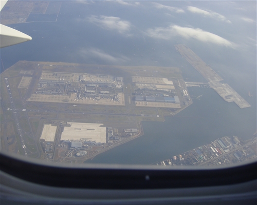 仕事で富山へ。羽田空港から富山空港へ。羽田空港を離陸、眼下に工事中の羽田空港の4本目の滑走路であるD滑走路が見えた。D滑走路の構造は,多摩川の流れを妨げないように桟橋と埋立を組み合わせたハイブリッド工法を採用しているのだ。滑走路2,500mのうち,手前の多摩川の河口域にかかる部分を桟橋工法,そのほかを埋立工法で施工。2010年10月の供用開始を目指して工事が進んでいるのだ。20分も経ったであろうか、遠く円錐型をしている浅間山が見えてきた。標高2568m。世界でも有数の活火山として知られた山である。雪の頂上から白い噴煙を上げているのが見えた。以前に比べて噴煙の量が治まっているようであった。手前に木崎湖そして青木湖が見えてきた。フォッサマグナの西辺の糸魚川静岡構造線による地溝上に出来た湖。入社の年に、この青木湖にスキーバスが転落し多くの死傷者が出た事件を思い出した。そして黒部ダムと黒部湖が眼下に。日本を代表するダムの1つであり、富山県東部の黒部川上流に建設されたアーチ式コンクリートダム。ダムの高さは186mで日本一。ダムに貯えられた水を利用している発電所が黒部川第四発電所(黒四)であることから、黒四ダムとも呼ばれているのだ。まだ周囲に積雪は見られない。そして既に雪で真っ白な室堂平、小さく立山高原ホテルが見えた。ここへの道路である立山黒部アルペンルートは既に閉鎖しているのだ。右から浄土山⇒雄山⇒男汝山⇒富士ノ折立と連なる尾根が見事に見えた。富山平野を抜け富山湾へ出る。日本の湾のなかでも、水深の深さと魚の豊富さで知られている。我が飛行機は能登半島の先端近くまで行きUターンし富山空港に着陸。仕事の目的地である我が事業所のある下水処理場は、バックに見事な立山連峰を抱いているのだ。富山市下水道局の近くの公園から見た立山連峰である。右端に大日岳、中央に今話題の剣岳の勇姿が。翌朝、ホテルで朝食中に立山連峰からの昇る朝日。そしてホテルのフロントの壁には350万分の1の『逆さ日本地図』が貼ってあった。これは富山県が作成した「環日本海地図」。この地図、南を上に北を下に設定しているが、単純に日本地図を逆さにしたものではなく、この姿が正体で地名などの表記もこの向きに表示されているのだ。富山市を中心に、同心円で距離(500kmごとの)が描かれているのだ。地図を逆さにするだけで、いつもの日本列島が違って見えてくるのだ。日本海は、諸国に囲まれた湖のような存在であることを実感。そして我が家の地は東アジアの最も遠い地であることを再認識し新鮮な驚きを感じることが出来たのだ。昼食時のレストラン駐車場横にある赤い山茶花の花が芝生に舞い散っていた。【山茶花の散りにし花の紅色(いろ)さえて、遠く立山は白く輝く 】 .........詠み人知らず......立山連峰の白い山々を眺めながら、富山周辺をレンタカーで移動し仕事をして来た恵まれた2日間であった。