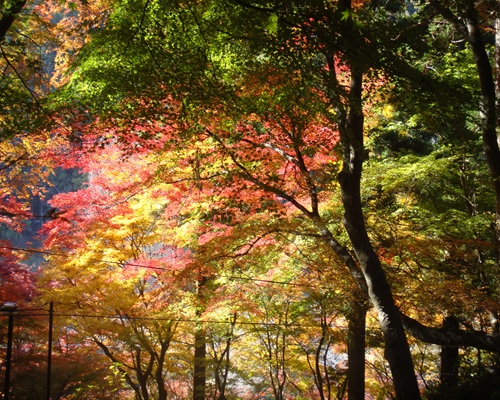 翌朝は、香嵐渓の紅葉見物のため早朝6時にホテルを出発。通常の朝食は7時からであるが、ホテルのご配慮で出発時には朝食用のおにぎりやコーヒーが準備されていたのである。急ぎながら朝の朝食を取り10分遅れでスタート。昨年も同じ時間に出発したが、駐車場入り口で既に渋滞が始まっていた。よって今年も同じ時間出発を決定。この地の観光は如何に近くの駐車場を確保するかにかかっているのである。香嵐渓近くまでは153号線で順調に車は進んだが、足助大橋の手前で既に大渋滞。暫く進んだが巴川の対岸の道に進路変更を決断。この辺は何回かこの渋滞を経験し、しかも地元の方が同乗している強みか。これにより車は順調に目的地の足助城駐車場に到着。足助城駐車場は標高391mの真弓山頂上付近にあり、駐車場の穴場であることを学習済み。わたしはここに4年連続の観光なのである。足助城址の開園時間は9時、足助城への山門は閉鎖中。8時開門と勘違いしたため、徒歩でこの山を下り、香嵐渓観光を先に済ませることを決断し、20分ほどで真弓山を下りる。香嵐渓の落部駐車場には既に多くの車が駐車していた。そして巴川沿いの遊歩道を歩き始めた。まだ早朝のため、晴天であるが朝の陽光がこの遊歩道に届いていないため真っ赤な紅葉も鮮やかさが今一。帰路に期待し待月橋に向かって脚を進める。すると、既に光を浴び真っ赤に輝きはじめた紅葉が迎えてくれた。三州足助屋敷の銀杏も鮮やかな黄色に変身しスッと立っていた。広場では既に猿が元気に芸を披露していた。対岸の山も日光を浴び錦秋の姿に。山ごと谷ごと見渡す限り ことごとく紅葉していた。そして陽光の移動につれて、色合いが刻々変化するのだ。今朝と翌朝とで色調の濃淡が僅かずつ変わっていくのである。待月橋を渡りビジターセンターの出店を巡る。この後、国道153号線にかかる巴橋を渡る。既に渋滞のまっただ中。再び真っ赤な待月橋が紅葉の合間から見えてきた。こちらも観光客で賑わってきていた。黄色のモミジも赤と同様に存在感を示していた。そして益々陽光が強くなる中、光を透かして鮮やかに輝く紅葉。そして香積寺への坂道を登る。