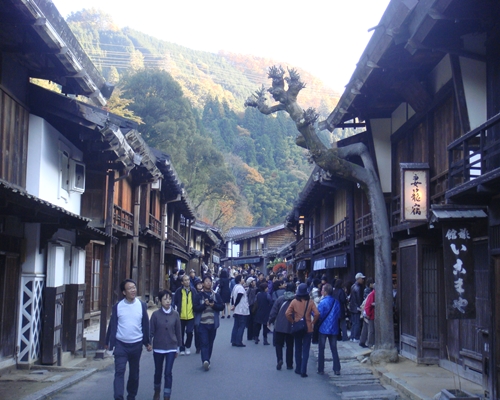 香嵐渓から東海環状自動車道~中央自動車道を利用し中津川インターで降り妻籠に向かう。とりあえずカーナビの設定を馬籠・藤村記念館の電話番号に設定するも『該当なし』との表示。他の馬籠の店屋の電話番号で登録するも同じ。不思議に思いながらとりあえず出発したが、同乗のKさんの携帯電話からの調査で原因が判明。この地域の電話番号が局番から変わっていたのだ。長野県山口村だったのが「平成の大合併」で岐阜県中津川市に、県をまたいだ合併が行われていたのであった。馬籠宿は属する県が変わったという全国でも珍しい越県合併の舞台なのであった。そしてこの車のカーナビがバージョンアップされていないためであったのだ。なんとかSさんの車の後を追いかけ妻籠に到着。徳川家康によって「宿駅」が定められ、江戸から42番目の宿場として整備された妻籠宿は中山道と飯田街道の分岐点に位置し、古くから交通の要所として栄えた街。昭和43年に町並みの保存が始められ、昭和51年に国の重要伝統建造物保存地区に選定される。全長約500mの町並みは、江戸時代にタイムスリップした感じで、どれも当時の面影を残し、懐かしさと郷愁を感じる情緒いっぱいの宿場町。宿場町は観光客でごった返していた。妻籠宿本陣江戸時代、大名など身分の高い人が宿泊した本陣、最後の当主だった藤村の兄、島崎広助が東京に出たため明治20年代に建物は取り壊された。現在の建物は1995年建築のもので、江戸時代の間取り図をもとに忠実に復元されたもの、石置き屋根に当時のようすが偲ばれたのだ。街の軒下には渋柿が乾されていた。黄色の柿とその陰のバランスが美しかった。街外れの水車小屋。妻籠の全国唯一のモノ、それがこの木製の黒ポスト。ポストと言えば赤いというイメージだが、この黒ポストは明治20年から実際に使われていたもので「夜明け前」にも開局当時の様子が登場する妻籠郵便局を町並みにあわせて復元する時に一緒に復元したものとのこと。脇本陣奥谷 代々脇本陣・問屋を勤めた家で、現在の建物は明治10年にそれまで禁制であった桧をふんだんに使い、当時の粋を集めて建てたものとのこと。また、島崎藤村の初恋の相手「ゆふ」さんの嫁ぎ先。国の重要文化財。妻籠の観光を終わり馬籠に戻る。途中この日も美しい夕日に出会えたのだ。中山道の難路、木曽路の最南端に位置し、宿場町として栄えた馬籠。全長600mの石畳の坂道に沿って、軒の低い格子造りの家並みが宿場時代の面影を残す。夕暮れの石畳が旅愁を感じさせてくれた。明治28年の大火事により江戸時代からの建物は焼けてしまったが、町の人達の努力で、当時を彷佛させる町並みを復元された。文豪・島崎藤村の生まれ故郷としても知られ、名作「夜明け前」の舞台にもなった宿場町。藤村記念館(島崎藤村生家跡) 島崎藤村のゆかりの品を展示されているとのことだが、既にこの日は閉館。馬籠の入り口に建つホテルの庭の紅葉は見事にライトアップされていた。この日の観光を終わり、中央高速自動車道で岡崎まで帰ろうとしたが、中央高速は事故で大渋滞。Sさんの新型のカーナビが能力を発揮し一般道で帰ることに成功。予定より1時間強の遅れで連泊のホテルに到着。そしてこの日も大宴会。翌日も6時出発を確認してホテルの部屋に戻ったのであった。