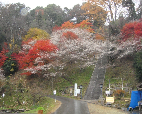 観光最終日のこの日も、渋滞を避けるため早朝6時にホテルを出発。今回の旅友は皆『punctual persons』である。岡崎インターから東海環状自動車道・豊田藤岡ICから国道419号線で小原へ向かった。あいにくこの日は雨、そしてこの雨が時々激しく降ってきたのだ。そして最初の目的地『薬師寺』に到着。真言宗瑠璃光山薬師寺は、地元民に川見の薬師さんと呼ばれて親しまれている古刹で、本堂や彫り物などなかなか味があるので、100段の階段を登ってでも見る価値はあるのだがこの日は雨が激しかったため諦め下からの鑑賞となった。創建は室町時代だとか。そしてこの寺の横の山全体は四季桜と紅葉のコントラストが広がっていたのだ。小原地区の四季桜は、江戸時代の豊田市小原北町の藤本玄碩という医師が苗を植えたのが始まりとされ、現在地区内に小原四季桜約8000本もの木が植えられているとのこと。小原の四季桜は、マメザクラ×エドヒガンの種間雑種。開花時期としては、4月上旬と10月下旬から12月上旬までのこの時期で、一番の見頃は、11月中旬~12月上旬頃なのである。もちろん年、気候によって多少の違いがあるが。★小原『和紙のふるさと』小原は、室町時代から和紙の産地として有名なところで、その伝統は今も続いているのだ。和紙工芸館では紙すき体験が出来るのであったが、この日は団体の大型予約が入っているとのことで断念。和紙の原料は「コウゾ」というクワ科の木だ。これを蒸して皮をはいで、水で晒してソーダで煮る。それをよくかき混ぜて、テレビでよく見るような木の板にすくってゆさゆさ揺らして、乾燥させれば出来上がりなのだが。★泥打観音(どろぶちかんのん)この日も泥だらけの観音様に逢えたのだ。この泥打観音には変わった伝説があると。昔、仏像は泥の田んぼの中に埋まっていたと。近くの百姓がきれいに洗って安置したが、次の日また泥の中深く埋まっていた。また洗って元の位置に戻すと、次の日もまた泥の中に埋まっていたというのだ。それ以来皆は泥をぶつけてお参りするようになり、人知れぬうちに泥をぶつけると願い事が叶うというようになったとのこと。私も雨の中、手を汚しながらも泥を投げつけ見事にお顔に命中。★西運寺桜と紅葉が見事に溶け合ったいる寺の参道。桜と紅葉が幻想的な風景を演出。この寺はこの日も雨もあり、人もあまりいないし、桜も紅葉も見頃と好条件。雨に濡れた桜の花がバックの紅葉に映えていた。境内から下の参道を。★小原四季桜公園最後にメイン会場の小原ふれあい公園へ。雨のため案内された駐車場は地面がグチョグチョ。上にある舗装された駐車場の山の斜面は見事に紅葉していた。 この旅行で多いに紅葉を楽しんだのであったが、<紅葉のメカニズム>について幼き頃学んだ事を思い出しながら調べてみた。私たちがいつも当たり前のように楽しんでいる紅葉だが、実は科学的なメカニズムの上に成り立っているのだ。今回はそのメカニズムについて学んだのでここに紹介したい。紅葉・・・冬が近づき寒くなってくると、葉と枝を切り離す『離層(りそう)』と呼ばれる層ができるのだ。この『離層』ができると葉と枝の物質の行き来が難しくなり、葉で作られた糖分が、葉に留まるのだ。その糖分が太陽光と反応すると、赤色色素『アントシアニン』となり、葉の色が赤く見えて来るのである。黄葉・・・植物の葉には『緑色色素(クロロフィル)』と『黄色色素(カロテノイド)』が含まれているが、普段は『緑色色素』の方が量が多いため葉は緑色に見えるとのこと。しかし、寒くなってくると『黄色色素』より『緑色色素』の方が早く分解されるため、『黄色色素』の割合が多くなって黄色の葉に見えると。 美しく紅葉させるには??昼夜の温度差が激しいほど、葉は美しく染まるのである。今年は夏の暑さと急激な温度低下によりこの地の紅葉も素晴らしいものになったのであろう。<紅葉狩りは、なぜ「狩り」なのか?>日本では、紅葉をめでる習慣は平安の頃から始まったとされ、古くから秋になると紅葉を見物する行楽、紅葉狩りに出かける人が多かったのだ。現在も毎年、紅葉の名所と言われる場所には行楽客であふれるほどになる。では、なぜ「狩り」なの?と思われる人も多いのでは?草花を眺めるという意味で使われているが、「ぶどう狩り」や「いちご狩り」のように、実を採るように紅葉を手に採り眺めたからとも言われていると。 この後、車を走らせ豊橋駅で女性群と別れ、帰路につき東名高速に向かおうとしたがこの日は平日のため通常料金。明朝0時過ぎに料金所を出れば勤労感謝の日の祭日のため料金は1000円。これを選択し、浜名湖の大きなリゾートホテルに立ち寄り、温泉につかり時間調整。猪鼻湖(周囲約12kmの浜名湖の支湖で、瀬戸と呼ばれる水道で浜名湖に通じている)を眺められる露天風呂等を楽しむ。そして三ヶ日インターから東名に乗る。最後に足柄サービスエリアで1時間ほど仮眠しこれも時
