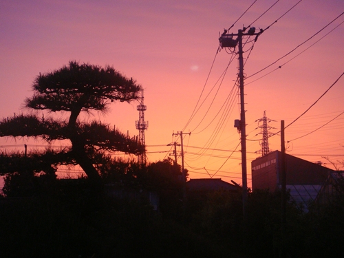 今週月曜日の朝は素晴らしい朝焼けの姿が我が部屋からも見えました。我が部屋の前の畑には道路を隔てて、見事に手入れのされた松が植えられているのです。「朝焼けは雨の兆し」と言われること が多いようですがやはりこの日以降は雨が降り出しました。明日までははっきりしない天候が続くようですが、土日は好天に恵まれて欲しいのです。
