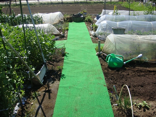 我が家の横の菜園の通路に人工芝を敷設しました。 先日の夜、妻が野菜を収穫に行き、通路で誤って滑ってしまいケガをしてしまったからです。昔は廃絨毯を切断して敷いていましたが、劣化が早く隙間から雑草等が生えてきてしまうため養蜂の師匠からベルトコンベヤーのゴム板を戴き、それを廃絨毯の上に敷設していたのです。妻はサンダルで農園に向かったため、そのゴム板の上で滑り転倒してしまったのです。私は農園作業時は、常に長靴を履きこのゴム板の上を歩いていましたので、殆ど滑った記憶がないため滑りやすいことに気がつかなかったのです。 ホームセンターでロール売りの廉価な物を購入してきました。妻の意見もありゴム板が全面新たな人工芝で被われるようなサイズの人工芝としました。ロールで指定長さ分を購入し、ゴム板の幅で無償でカットしてもらいました。本日敷設し、動かないよう金釘を等間隔で下のゴム板を貫通させ固定しました。畑のほぼ真ん中を十字型に敷設しました。購入したものは雨でも自然に雨がぬけ、水たまりができにくい構造のはず。ゴルフのパターの練習も出来そうですが私のゴルフは小学校時代で卒業したのです。人工芝で滑りにくくなったのですが、年と共に足下が衰えることは事実ですので、今後もお互いに気をつけたいと思っています。そして妻の1日も早い回復を!!。