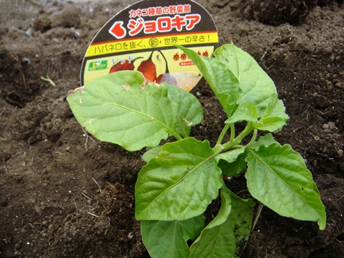 園芸店に夏野菜の苗を買いに行った折り、今年も激辛野菜の苗を2本ずつ購入して来た。 ハバロネ、鷹の爪そして今年初めての『ブート・ジョロキア』の3種類。『ブート・ジョロキア』は北インドおよびバングラデシュ産のトウガラシ属の品種。ギネス世界記録でハバネロを抜いて2007年に世界一辛いトウガラシとして認定された品種。『ブート・ジョロキア』のスコヴィル値(辛さの単位)は、100万以上。普段使っているタバスコソースが2,500から5,000。北インドでは、畑や民家を荒らす野生ゾウを撃退するためにブート・ジョロキアをすり潰して柵に塗ったり、ブート・ジョロキアを利用して対ゾウ用のトウガラシ発煙筒を開発する試みがなされているとのこと。ブート・ジョロキアの実。順調に育って下の様な実をたくさん収穫したい物である。 ( http://digimaga.net/2009/04/indian-woman-blazes-through-chili-eating-feat)より世界一の座をジョロキアに奪われたハバネロ。スコヴィル値は10~35万くらい。一昨年収穫したハバネロの実。タカノツメの苗。スコヴィル値は4~5万程度とのこと。コロンブスがアメリカ大陸からヨーロッパに伝えたものは数多くあるが、その中のひとつが唐辛子。アメリカ大陸以外では歴史の浅い野菜であるが、東南アジア、朝鮮半島、中国南部などの食生活を大きく変化させたことは周知の事実。唐辛子は激辛なだけではなく、ビタミン豊富な野菜。胃腸を温めるので、冷えによる腹痛や下痢に効果があるのだ。しかし上記の目的のために栽培するのではない。珍しい野菜も栽培してみたいの、すこぶる『遊び心でAgriculture』なのである。