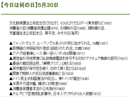 今日5月30日は『ゴミゼロの日』。「ゴ(5)ミ(3)ゼロ(0)」の語呂合せから。各都道府県の環境美化推進協議会が実施している。尚、5月30日~6月4日は、 ごみ減量化・リサイクル推進週間。街中のゴミを拾い歩く運動で、1975年(昭和50年)に愛知県豊橋市が始め、全国に広がった運動とされているとのこと。この運動の基本はゴミを拾うことよりも「自分のゴミは自分で持ち帰りましょう」を合い言葉に示されているように、ゴミを捨てない心を養うためにゴミを拾うという啓蒙運動。公害防止への生活習慣を養うことであり又ひいては思いやりの精神へそして人の和にさらには世界の平和へと進められるもの。最近、駅の構内などの公共施設に設置されているゴミ箱の数が大幅に少なくなっている事に気がつくのである。現在地球の人口は年々増加の一途を辿っており、将来この巨大な人口を支える為には限りある地球資源の有効利用しなけれならないのである。地球資源の有効活用を図る為にも530運動の精神は生かされなければならない。ゴミの分別収集、リサイクルによる再利用を図ることで地球環境と共生してゆかねばならないのである。しかし高速道路のゴミ箱、コンビニのゴミ箱等、公共施設のゴミ箱にどうみても、分別されてないゴミ、自宅のゴミ、危険物などゴミ箱に入っていることが見受けられるときが最近よくあるのである。これは犯罪行為ではないだろうか? そして福島第1原発事故では、原発敷地内のみならず、広範囲で放射性物質による汚染が疑われる土壌や瓦礫、建設廃材などの処分先の目処が立っていず、周辺自治体はその保管や処分方法に頭を悩ませている日々が続いているのである。その他に今日は以下の如き記念日。「消費者の日」 1978(昭和53)年に政府が制定。経済企画庁(現在の内閣府)が主催。 「掃除機の日」 1986(昭和61)年に日本電機工業会が制定。ダニや黴が多く発生する梅雨どきに向けて、掃除の大切さを呼びかける日。 「文化財保護法公布記念日」 1950(昭和25)年、「文化財保護法」が公布。
