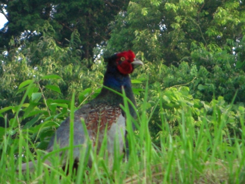 昨日早朝、我が養蜂場のある菜園に点検に行く途中の林で雄の雉と1週間ぶりに出会いました。数年前からこの林を住み家として?つがいで我が農園にも遊びに来ているのです。キジは日本の国鳥。また国内の多くの自治体で「市町村の鳥」に指定されているのです。大きさは雌雄で差があり、オスのキジが大きくメスは一回り小さく、雄は翼と尾羽を除く体色が全体的に美しい緑色をしており、頭部の羽毛は青緑色で、目の周りに赤い肉腫があり美しく良く目立つのです。キジの鳴き声は「ケーン、ケーン」と鳴いた後、羽をバタバタと大きな音で振るわせますので直ぐ何処にいるのか解るのです。「雉も鳴かずば打たれまい」ということわざがありますが、上記の如く甲高い声で「ケーン、ケーン」と鳴くため自分の所在を簡単に見つけられて猟師に撃たれてしまうということから生まれたことわざなのです。しかし地震予知能力があるようで、以前に鳴き方がいつもと異なるため不思議に思っていた直後に、農園にいても解るような大きな地震があったことを想い出します。地震の前に、動物が反応するということが言われていますが、まさにその反応の一つと思える体験を野外でしたのでした。WIKIPEDIAによると・「ケーン」と鳴き、「けんもほろろ」という言葉は、この鳴き声に由来している。・「頭隠して尻隠さず」ということわざは、草むらに隠れたつもりになったキジの様子に 由来しているとのことです。菜園に出没するこのキジは、以前は、私が現れるとスーっと草むらに消えて行ったのですが、最近は、私の姿を見かけても距離が遠いとまるで知らん顔をし、かなり近づいてもゆっくりと私との距離を保つぐらい離れるだけで、慌てて姿を消すことがなくなってきたのです。危険性のない優しい人間!!だと解ったのでしょうか?。お陰で最近は上の写真の如く、ズームでの写真撮影を許してくれる仲なのです。その内につがいで、数匹のひな鳥を連れて歩く姿を見せてくれる事を楽しみにしている「趣味の農園主」なのです。