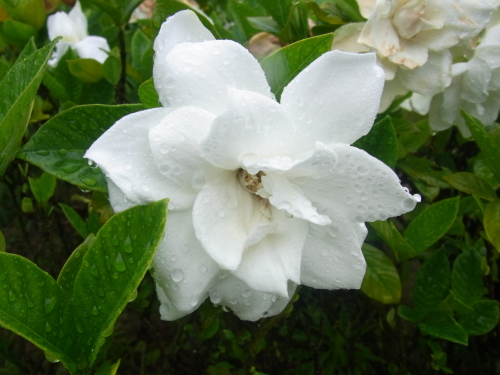 四国に出張の折、事業所の植栽に可憐な白い花が。八重咲きのクチナシの花。花びらが雨に濡れていた。クチナシの花は深みのある清楚な白い花、八重と一重があるが、いずれも香りがよく好きな花のひとつ。八重咲きの花はバラのようで、豪華さが。これも品種改良?果実が熟しても割れないため、「口無し」という和名の由来となっている説も。我が家にも小さな一重?のクチナシの木があるがなかなか花を咲かせてくれないのであるが。