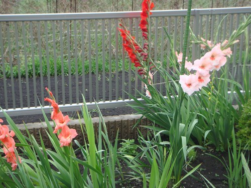 我が家の庭のグラジオラスが色とりどりの花を開かせています。地際から先端のとがった平べったい葉っぱを左右交互に出します。グラジオラスの名前はラテン語のグラディウス(剣)からきており、葉の姿に由来するとのこと。球根からはなく黄を長く伸ばして、花を穂状に咲かせます今はユリの花に隠れているものも。これからはグラジオラスが主役。花の色も形も様々なバラエティーがあり実に多彩な我が庭のグラジオラス。 6弁の漏斗状の花を横向きに多数開くかせています。江戸時代に、オランダ船がもたらしたことから和蘭菖蒲といわれた。現在栽培されているのは明治以降の輸入種とのこと。せっかく咲いたのに倒れやすいのが弱点。 支柱を立ててやればよいのですが・・・・・。