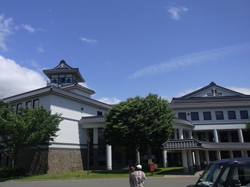 新青森からレンタカーで弘前に向かう。途中田舎館村の村役場に立ち寄る。城のような村役場。この裏に毎年多くの観光客が訪れる『田んぼアート』が。1993年、田舎館村が村起こしの一つとして、田舎館役場裏手の田んぼで始められた田んぼアート。田んぼをキャンバスに見立て、現代の米と「古代米」と呼ばれる古代に栽培されていた色の異なる稲を使って、巨大な絵を作っているのである。役場の展望台(専用エレベータあり、3階から更に階段使用)から望見できるのだ。2004年より、遠近法を用いて作付けした結果、展望台から無理なく美しく見えるようになったと係員の説明が。エレベーターで上がり共通料金300円を払い展望台へ。見事な悲母観音の姿が。生まれたての嬰児に甘露の水を灌ぐ観音さまを描いているのだ。観音様の様の顔も美しく繊細。風にほほが揺れていた。実は観音さまはすべて男性。よく見ると、ちゃあんとヒゲが見えるのだ。そして観音様を見上げる嬰児の姿。 甘露の水によって嬰児に命が与えられ、地上に降りていく姿を表現していると。3・11大震災への鎮魂と厄よけをテーマに「悲母観音と不動明王」の2つの絵が1.5haの水田に9種類の稲で描かれていたのだ。 そしてその隣に立つ不動明王。雲からの雷光をダイナミックに表現。1台の車が邪魔。進入禁止にすべきと我が儘にも。鋭い顔と眼を見事に表現。 そして背後で激しく燃えさかる炎を見事に表現していた。そして田んぼアートの歴史についてのパネル展示。近年の作品モチーフ2012年 - 「悲母観音と「不動明王」 第1アート:田舎館村役場庁舎東側の田んぼ 「七福神」・「マジンガーZ」第2アート:弥生の里(道の駅いなかだて)2011年 - 竹取物語2010年 - 弁慶と牛若丸、『五条大橋での戦い』2009年 - 戦国武将、ナポレオン2008年 - 恵比寿様、大黒様2007年 - 葛飾北斎『富嶽三十六景』の『神奈川沖浪裏』と『凱風快晴(赤富士)』2006年 - 俵屋宗達『風神雷神図屏風』2005年 - 東洲斎写楽『二代大谷鬼次の奴江戸兵衛』、喜多川歌麿『歌撰恋之部・深く忍恋』2004年 - 棟方志功『釈迦十大弟子羅ご羅の柵』と『山神妃の柵』2003年 - レオナルド・ダ・ヴィンチ『モナ・リザ』年ごとに複雑な表現に挑戦していることが解るのであった。そして五所川原に向かう途中にある第2会場へ。第2田んぼアートは『七福神』。作品が大きすぎてカメラに入りきれない。七福神の中の紅一点 弁財天の姿も見事。隣は毘沙門天?寿老人。長寿のシンボルである不老長寿の桃を持っていた。3.11からの早期復旧を願って福禄寿が持つ『順風復興』 の文字が風に揺れ浮き上がって見えた。遠く岩木山の姿も。残念ながら頂上は雲の隠れていた。そして新設した展望台。この田んぼアートが終わった後の使用法は??青空には一筋の白き2本の直線が。下から見るとなんだか解らない光景。