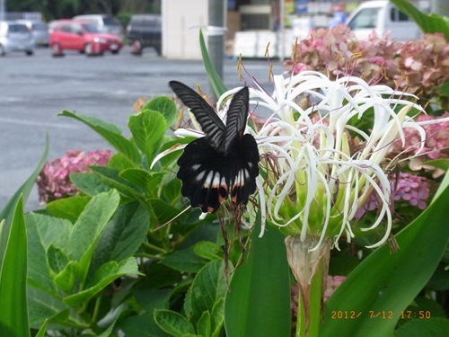 今週末は再び熊本・天草へ。レンタカーで移動時にコンビニでお茶を買うためにSTOP。ドアを開けて降りると、横の植栽に黒い巨大な蝶蝶が。翅(はね)を開いた大きさ100mm以上!!!花は白いハマユウ?翅は大きくて幅広く色は全体的に黒いが、後翅には大きな黄白色紋が。しかし後翅の突起がない。 帰宅してこの蝶の名前は何かを調べてみたが、『ナガサキアゲハ』の雌?『ナガサキアゲハを見わけるポイントは、後ろばねの尾状突起と呼ばれるしっぽのような部分があるかないかです。日本の黒いアゲハチョウでこのしっぽがないのはナガサキアゲハだけです。花の蜜を吸っている黒いアゲハチョウを見かけたらよく観察してみましょう』と。