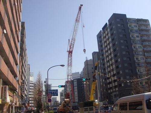 我が通勤路の山手通りに巨大クレーンが出現。先端までの高さは35~40m。トラッククレーンとラフテレーンクレーンの利点を併せ持つオールテレーンクレーンと言う機種であろうか?最大吊上荷重180Tの表示が。最大吊荷重には、実際に吊る荷の重さのほか、吊り具(滑車や荷を吊るためのフック)の重量も含んでいるため、実際に吊ることのできる荷の重さはこれより小さくなるのであるが。巨大ブームもトラス式の複雑な構造。幾つかの小型ブームも付属。ワイヤーの数も半端ではなかったのであった。実際に荷を吊っている姿を見たいものであったが・・・・。