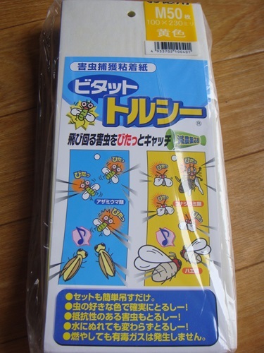 我が農園のスナップエンドウも、気温の上昇と共に元気に成長しています。先々週は支柱立て、網掛けを行い、今日はハモグリバエ対策を行いました。今年も通販でシートを購入しました。害虫捕獲粘着紙、ビタット トルシーは、農園やハウスで飛行する害虫を捕獲するのです。ビタット トルシーの鮮やかな黄色が飛びまわる害虫を寄せ集め、強力粘着材がビタットキャッチ!!雨にも強く、設置も簡単だと言う商品なのです。。 今回購入したシートは黄色のものですが、青色のものもありそれぞれ用途が異なるようです。 黄色のシートの効能書きです。「マメハモグリバエ」の文字が。部屋で梱包用ビニールヒモでシートを網に吊すように準備完了。農園に出て早速取り付けを行いました。白いカバーシートを外し準備完了。鮮やかな黄色はハモグリバエの好きな色とのこと。取り付けを終わって見ると既にハモグリバエが捕らえられていたのです。昨年のハモグリバエの被害の写真です。スナップエンドウの葉に白い筋がたくさん、これが、ハモグリバエの幼虫の食痕なのです。ハモグリバエは卵管を葉に刺して卵を植えつけ、この幼虫が葉の中を動き回るのです。「葉にもぐり込む・・ハエ」だから「ハモグリバエ」。そして葉に絵を描いたように食害する被害症状から、通称「エカキムシ」とも呼ばれているのです。直接、鞘ごと口にするエンドウマメなので、出来れば農薬は使いたくないので、毎年このシートで駆除を行っているのです。既にスナップエンドウは多くの白い花を付け始めています。サヤエンドウは、開花後14日~20日で収穫できますが、このスナップエンドウやグリンピースはやや時間がかかり開花後40日ほどで収穫できるようになるのです。でも今年のこの時期は夫婦でロンドン旅行中??留守中の収穫を御希望の方は書き込みをお願いします。鞘が柔らかく、鞘と豆の両方を食べることが出来るのです。鞘は肉厚で甘みが強いのです。さっと塩茹ですると鮮やかな緑と甘みが楽しめるのです。また、天ぷらにするとサクサクとした食感を楽しめるのです。そしてビールのつまみに最高なのです!!!