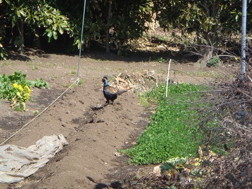 昨日、養蜂場のある農園に行ってみると農園の真ん中をキジのつがいが早朝散歩中。この農園はミツバチとこのキジが我が友なのです。しかし私の出現に戸惑い隣の山林に逃げ込む雄のキジ君。そしてその後を追うようにメスのキジ嬢が続く。メスのクチバシはオスと異なり褐色。キジの多くは3月下旬から7月までが繁殖期。新しい家族がお腹の中に入っているのだろうか?キジの家族での散歩の姿が見られるのを楽しみにしているのです。そしてもうもう一人?の我が友のミツバチ嬢も菜の花に戯れていました。温度が上がり、暑くなってきたので私が作業用上着を脱ぎ、自転車の荷物籠に入れておいたのですが、その上着の上で戯れているミツバチ嬢の姿も。