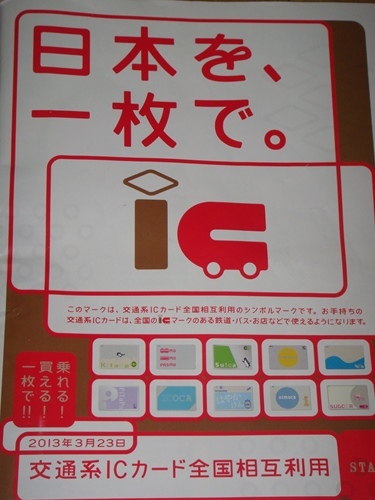 先日の3月23日から、交通系ICカードの相互利用が開始。JR東日本のSuica(スイカ)を初めとする交通系ICカード10種類のどれかを持っていれば、全国どこの鉄道でも乗ることができるようになったのです。JR車内の座席の後ろのポケットに入っている雑誌の裏表紙にも紹介が。JR駅構内には、その案内表示のパンフレットが。テレビ報道そして新聞によると、鉄道52、バス96の計148事業者(重複6)をカバーし、全国約9千駅の半分近い4275駅の自動改札機を1種類のカードで通過できるとのこと。IC機能が付随した携帯電話を含め、10種類で計約8198万枚が発行されていると。【http://headlines.yahoo.co.jp/hl?a=20130323-00000033-asahi-soci.view-000】より開始日の23日、名古屋の地下鉄に我がSICAを利用しましたが、無事改札を通過することが出来たのです。ただJR各社は全国を10のエリアに区分しており、エリアをまたいだ使い方はできないとのこと。我がカードはチャージ残金が千円以下になるとオートチャージ機能でチャージされる様にしているが、この機能も全国で有効なのであろうか?