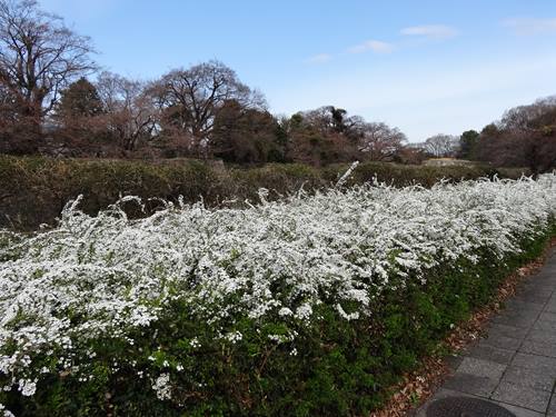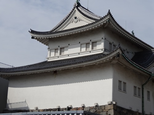 土曜日のこの日は、帰任前に名古屋城を同僚と訪ねました。地下鉄名城線で「栄」から乗車し「市役所」で下車。もちろんSUICAを利用。地上に出て名古屋城二の丸エリアに向かう。ユキヤナギの白い花が見事。二の丸付近。 復元進行中の名古屋本丸御殿は5月29日から公開とのこと。東門にあった名古屋城MAP。東門に9時10分前に到着し開門を待つ。名古屋おもてなし武将隊の一人?が出迎えてくれた。 9時の開門一番乗りで入場、ここで日本100名城のスタンプをGET。桜マップ、しかし未だソメイヨシノは1~2分咲き.名古屋の地は春の訪れが遅かったのであろうか。このピンクの濃い桜は満開、そして天守閣が。 青空に金の鯱も輝いていた。 名古屋城 東南隅櫓。名古屋城に現存する三つの隅櫓(すみやぐら)の一つで、「辰巳櫓(たつみやぐら)」とも言われる重要文化財。櫓とは、物見のほか、防戦、食糧・武器貯蔵などを目的に、城地の四隅の石垣に建てられたもの。東南隅櫓は、名古屋城創建(1612年)当時の原形を伝える建物で、外観は2層であるが、内部は3層となっているとのこと。 杉の巨木を切断したのであろうか。切断面が見事な石垣になっていた。このように樹木の根や幹が石垣を壊していくのであろうか。逞しい生命力。 表二之門手前からの空堀。表二之門。重要文化財で古くは南二之門といわれ、門柱・冠木とも鉄板張りとし用材は木割りが太く堅固に造られてた。 袖塀は土塀で鉄砲狭間を開いて要害としての堅固さを示しているのだ。 復旧中の本丸御殿・玄関部分の見事な屋根。ヘルメットを被り内部見学。下御膳所の巨木による梁。屋根の小屋組みが順調に組みあがっていました。玄関の屋根の破風もよく素晴らしい。金色の三つ葉葵が光っていましたが上部が写っていませんでした。そして天守閣。手前の桜は未だ蕾。名古屋城は、織田信長誕生の城とされる今川氏・織田氏の那古野城(なごやじょう)の跡周辺に、徳川家康が九男義直のために天下普請によって築城したとされるとのこと。以降は徳川御三家の一つでもある尾張徳川家17代の居城として明治まで利用されたと。大小天守や櫓、御殿の一部は昭和初期まで現存していたが名古屋大空襲(1945年)によって天守群と御殿を焼失した為1959年再建されたと。望遠にして天守屋根に載る現在の金鯱を撮影。
