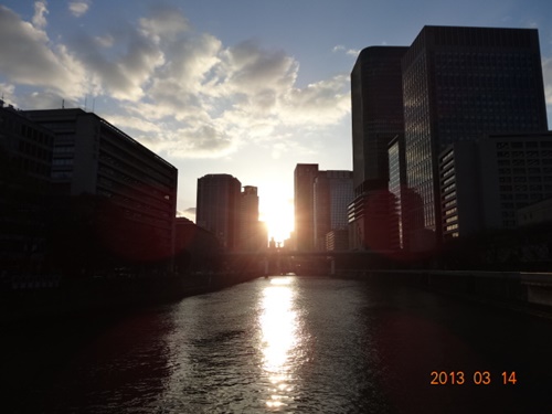 堺市の下水処理場の見学を終え我が社の関西支社に立ち寄る。淀屋橋からの夕陽。下を流れるのは土佐堀川。川面の映る陽光が美しかった。そしてこの日は近くのホテルに宿泊。我が部屋からの早朝の町並み。朝食は最上階のレストランへ。屋外に出て、早朝の大阪の町並みを撮影。 ビルの合間に遠く大阪城の姿も見えたのであった。我がデジカメの望遠で撮影。まだ日本100名城のスタンプは未制覇の城なのである。