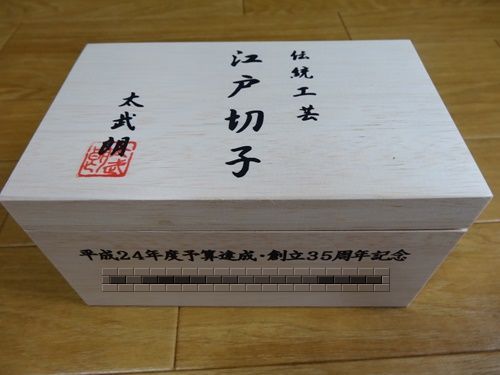 会社から『平成24年度予算達成、創立35周年記念』の品物が送られてきました。立派な桐の箱に入っていました。伝統工芸 江戸切子 太武 朗 の墨の文字が書かれていました。中には赤と青の江戸切子 ペアタンブラー一組が。中には江戸切子 の説明書が同封されていました。江戸切子とは江戸末期に江戸(現在の東京)で始まったカットグラス工法のガラス工芸・細工。伝統工芸に認定されているガラス工芸品・地域ブランドの一つとのこと。色被切子(いろきせきりこ)とは色被せ硝子と言う、違った色の複数の層からなるガラスからの切子とのこと。江戸切子の技法やサンドブラストによって表面加工を施すことにより、その研磨加工部分が無色ガラスとなり美しい工芸ガラスとなるのだと。白の模様が鮮やか。クリスタルの色被切子グラス2個セット。日本酒グラスにちょうど良い大きさ。美しい青色と赤色の繊細なカット、いつもの酒の時間をより優雅に感じさせてくれること間違いなし。作者の【平山紋治】氏は、東京都伝統工芸士認定者の一人とのこと。薩摩切子は付着している色の厚みが2~3ミリで淡い感じ。それに対して、江戸切子は1ミリを切る ほどに薄く作られていて鮮やかな感じなのです。それとカットの仕方も「江戸切子」はシャープなのが多く「薩摩切子」は幅が広くシャープさが「江戸切子」ほどでないものが多いのでは。中には社長の熱き言葉が同封されていました。熱き表現にも感動したのでした。