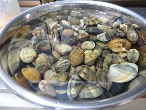 宿泊ホテルで伊万里から早朝にレンタカーで長崎空港に向かう準備をしていると大切な友人のNさんがわざわざ朝の6時前にアサリをホテルまで持ってきてくれました。自ら海に入り収穫されたものなのでしょうか。自宅に持ち帰り早速妻がボールに入れ砂抜き。先日、義兄からも頂きましたが大きさが全く異なる大きな粒ぞろい。貝殻の模様は横しまや様々な幾何学模様など非常に変異に富み、同じ模様をした個体はいないのである。早速、妻がクラムチャウダーにしてくれました。牛乳をベースとした白いクリームスープ。玉ねぎやジャガイモ、ニンジンなどの野菜が加えられて美味。そして昨晩はオーソドックスにアサリバター。中の身も十分に大きいのでした。そしてこの日は、我が農園の野菜をリッチに入れた焼き餃子も。更に我が農園から新芽の三つ葉を摘み取った三つ葉のかき玉汁。春の海の幸と我が農園の陸の幸を多いに楽しませて頂いたのです。
