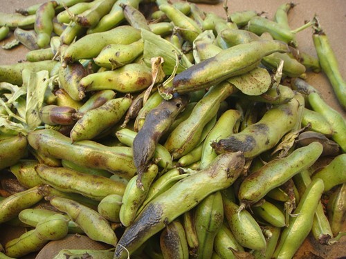 空豆の収穫の最盛期も終わり、先週末に片付けを行いました。とは言え。今年は大収穫でまだまだ多くの実がついていました。しかしながらアット言う間に鞘が黒くなり皺が入り弾力を失っていくのです。 まだまだ若い身の鞘ををやさしく開けてみると、白いフカフカのダブルベッドに仲良く。自宅に持ち帰り、鞘を剥くこと約1時間。段ボール箱の中は空豆の実が一杯。 枝豆には夏場に不足しがちなビタミンB1が豊富に含まれており、大豆に少ないビタミンAやC、ミネラル類も豊富に含まれているのです。血液を作る材料となる鉄分やたんぱく質、そして 血液を作るときに必要となる銅、その吸収を高める為のビタミンCなのです。 空豆はチグリスユーフラテス河流域からエジプトで4000年以上も前から食用として栽培されていたとのこと。日本には奈良時代に伝えられたと。名前の由来は実が空に向けて実るから。