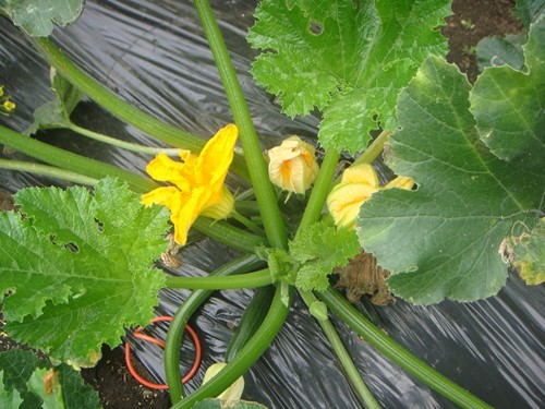我が農園のズッキーニも順調に成長し、いくつかの花が咲いています。3月に種を購入し種まきし、ポットで大きくしたものを植え付けました。近年特にポピュラーとなりつつあるのが、このズッキーニ。見かけはキュウリに、食感はナスに似ており、近年、一般家庭でも油炒め、天ぷら、煮物、スープなどに利用されるようになったのです。別名のつるなしカボチャの通り、つるが伸びず、葉腋に連続して雌花がつく節なり性。 鮮やかな黄色で大きな花。そしてズッキーニは外見がきゅうりと似ているため、きゅうりの一種では?と思いがちですが、実はかぼちゃの一種。ズッキーニは雌花が開花してから3日から5日で20cmくらいの実になるのです。このころにナイフやハサミを使って実の根元から切りとって収穫するのです。そろそろ収穫時期?