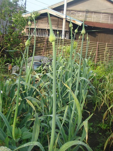 我が農園のジャンボニンニクも順調に生育しています。 太いジャンボニンニクの芽が出ています。隣で栽培していた普通のニンニクは途中赤さび病にかかってしまいましたがこちらは元気。 このジャンボニンニクの芽は摘んでしまわないと球根部分に栄養が行かない為、球根部分が大きくならないそうなので早めに切り取るのが良いのです。そして切り取った芽の部分は食べられるのです。 2本の上部の蕾を残しておきました。そして1週間後。西洋葱の仲間で本来のニンニクとは別物らしい。日本の葱の花に似ているにです。薄紫の葱坊主。花茎(ニンニクの芽に当たる所)が1m以上の長さになりました。そしてその上に野球ボ-ルぐらいの花が咲いています。壺状の小さな花がかたまって,球形に咲いているのです。