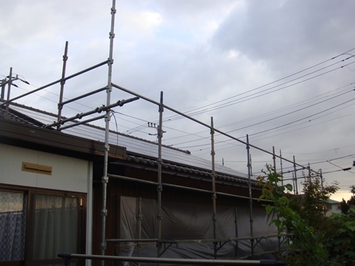 我が家も築30年以上を経過し、外壁の塗装工事を近所の住む職人さんに依頼しました。塗装の際の養生用ビニールシート、そして仮設2段足場が設置されました。 我が部屋の周囲も同様に。塗装前の高圧洗浄水の飛散防止用にの養生シートも貼られています。切妻部分の白壁塗装と破風板の補強もお願いしました。そして雨樋も新しいものに交換することとしました。 壁の高圧洗浄機でブロック塀も洗浄していただきました。お陰様でブロックが白く変身しました。 そして玄関のスロープも。 外壁の角波カラー鉄板は現在茶色ですが、家のイメージチェンジも企図して僅かに茶色を混ぜた白色にしました。現在、塗装工事もほぼ完了に向かっています。