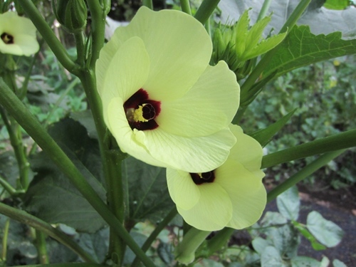 我が家の横の農園で栽培中の花オクラが開花を始めました。花オクラは、別名を「トロロアオイ」といい 、「花を食べるオクラ」なのです。今日は3輪収穫しました。長径20センチ以上の花びら。花びらの数は五角形のオクラと同じ5枚。 「オクラ」の花は大空に向かって上を向いて咲きますが、「花オクラ」は下から横へ向かって咲くのです。中心に雄しべと雌しべが一体となった柱が、そして先端は、突起してクルクル風車の如し。一本のめしべの先端は5つに分かれ、めしべの下の方におしべがついているのです。そして花びらの付け根はアントシアニンの深い紫色。 妻が軽く茹でてくれました。これを付け根でちぎって雄しべ、雌しべの柱を取り除きすし酢をかけました。ネバネバ風で、噛んでいるうちに、益々粘りが出て来るのです! 味はオクラの味!!暫くすると酢にアントシアニンが溶け出し、酢がピンク色に変わってくるのです。 市場やスーパーではほとんど見かけない食材。生産者のみが味わえるオクラの香りとオクラのヌルッとしたぬめりが楽しめるのです。