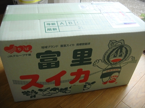 千葉に住む知人から今年の初物のスイカが送られて来ました。箱を開けると巨大スイカが二つ。今年は天候不良によりスイカの生育は遅れているとのニュースもありましたが。千葉・冨里産・生産者の名前入り。さてさて中はどうなのでしょうか?冷凍庫に丸ごと入れて冷やしておいたものを、来園された農園で同僚達と。 皮が薄く甘みたっぷり、今年の初物を楽しんだのです。