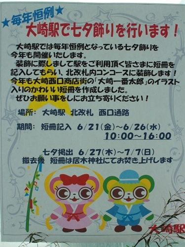 通勤に利用するJR・大崎駅で今年も七夕飾りが行われています。6月下旬から、北口改札・西口通路に大きな竹が横にされ置いてあり、この場所を利用する方々に短冊に願いを記入してもらっていたのです。そしてその七夕飾りは先日まで、北改札内コンコースに移動され飾られていたのです。今年は被災地復興支援の願いを込めて開催されているのです。七夕飾り終了後、願いが込められたこの短冊は近くにある居木神社に奉納され、焚き上げられるとのこと。今年の湘南ひらつか七夕まつりも天候に恵まれ非常に賑わったとのこと。それにしても、数え切れないほどの願い事がくくり付けられていて、短冊の向こうに願いを書いた様々な人の顔を思い浮かべることが出来るのであった。これも日本の古き良き伝統風習、大切にしたいと。